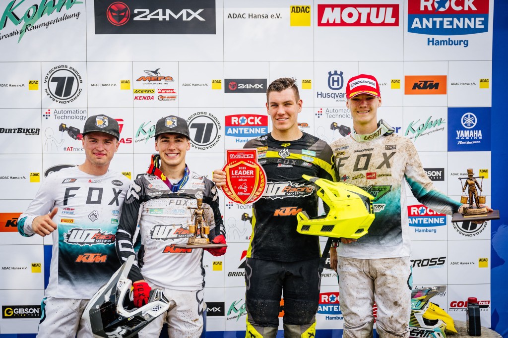 Die drei Rennen des ADAC MX Youngster Cup beim MSC Mölln begeisterten mit engen Positionskämpfen an der Spitze. Oriol Oliver setzte sich mit zwei Laufsiegen und einem zweiten Platz am Ende knapp gegen seinen Teamkollegen Mike Gwerder (CH/WZ-Racing) durch, der das zweite Rennen gewinnen konnte und ebenfalls alle Läufe auf dem Podest beendete. Die beiden großgewachsenen Piloten Edvards Bidzans (LVA/Sixty Seven) und Cato Nickel (D/WZ-Racing) waren von ihrem Tempo ebenbürtig und beendeten die Veranstaltung punktgleich hinter den Spitzenreitern. Aufgrund mit Rang drei eines besseren Ergebnisses im letzten Lauf wurde Bidzans als Gesamt-Dritter vor Nickel gewertet. Einen Durchmarsch von Oliver verhinderte lediglich ein Stein, der die Hinterbremse an der KTM des Spaniers im zweiten Lauf für zwei Runden außer Gefecht setzte. Nachdem die Bremse wieder funktionierte, fuhr er sich bis zum Rennende an das Hinterrad Gwerders heran, fand aber keinen Weg mehr am Schweizer vorbei.