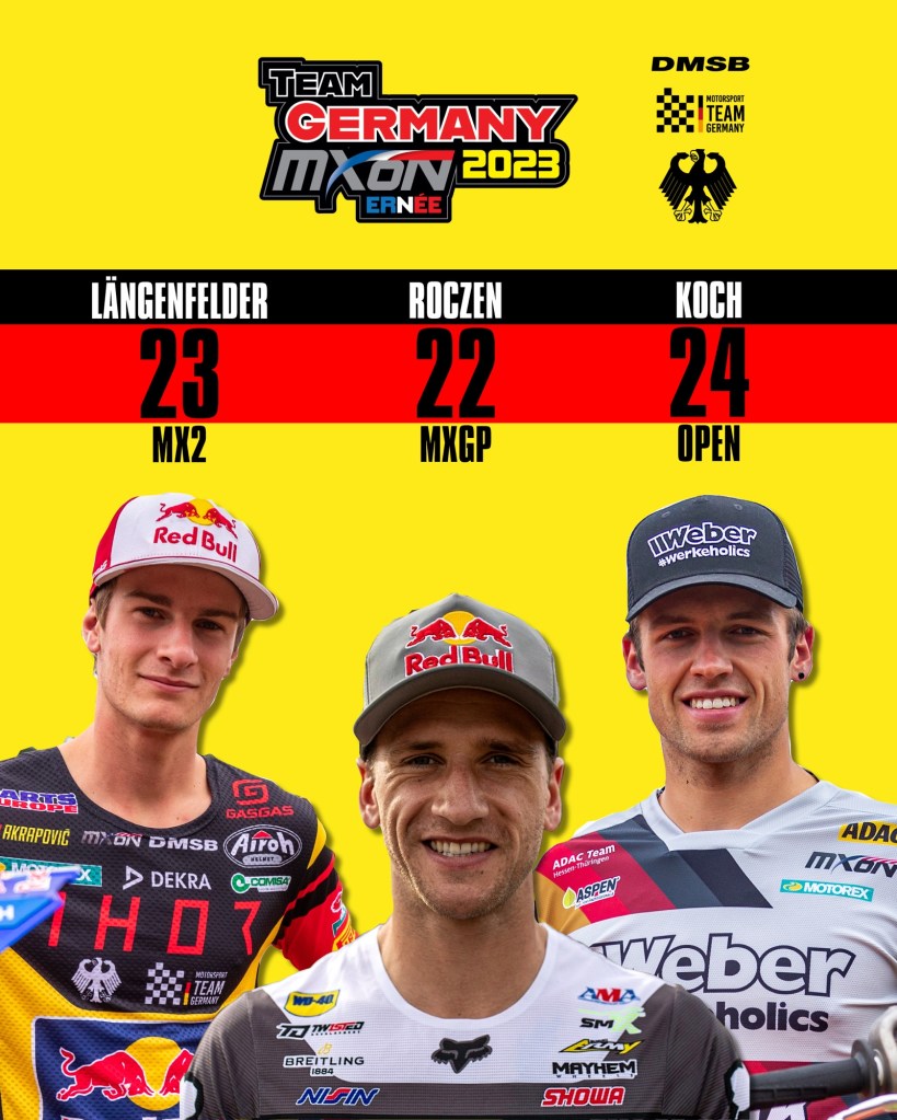 Frankfurt, 8.9.2023 — Das MXoN Team Germany für das 76. Monster EnergyFIM Motocross of Nations, das am 7. Und 8. Oktober im französischen Ernéestattfindet, steht fest. Die Teamchefs Marcel Dornhöfer und Karsten Schneider präsenterenmit Ken Roczen (MXGP), Simon Längenfelder (MX2) und Tom Koch (Open) eine sehrschlagkräftige Mannschaft. Maximilian Spies ist als Reservefahrer aufgestellt.