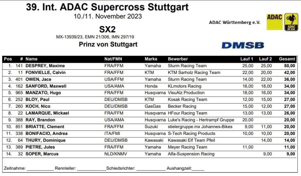 Im SX2-Finale ging es rasend zu. Lokalmatador Paul Bloy #252 / 11 hat eine starke Performance abgegeben. Er beendete das SX2-Finale auf einem hervorragenden sechsten Rang. Die Tagessieger wurden Maxime Desprey (FR) auf Platz eins, Calvin Fonvielle (FR) auf Platz zwei und Jace Owen (USA) auf Platz drei. Mit der Wertung von gestern eroberte sich Maxime Desprey wohlverdient den Titel „Prinz von Stuttgart“. Herzlichen Glückwunsch!